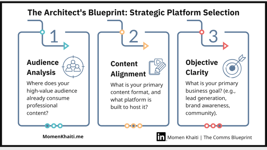 First, Audience Analysis. Where does your specific audience—your clients, your stakeholders, your potential recruits—actually consume professional content? Go where your high-value audience is already concentrated.